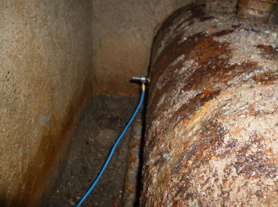 El antisarro electrónico se ha conectado a la tubería mediante la fijación de dos pernos soldados a la tubería para tener el mejor contacto para transmisión de la señal al agua.